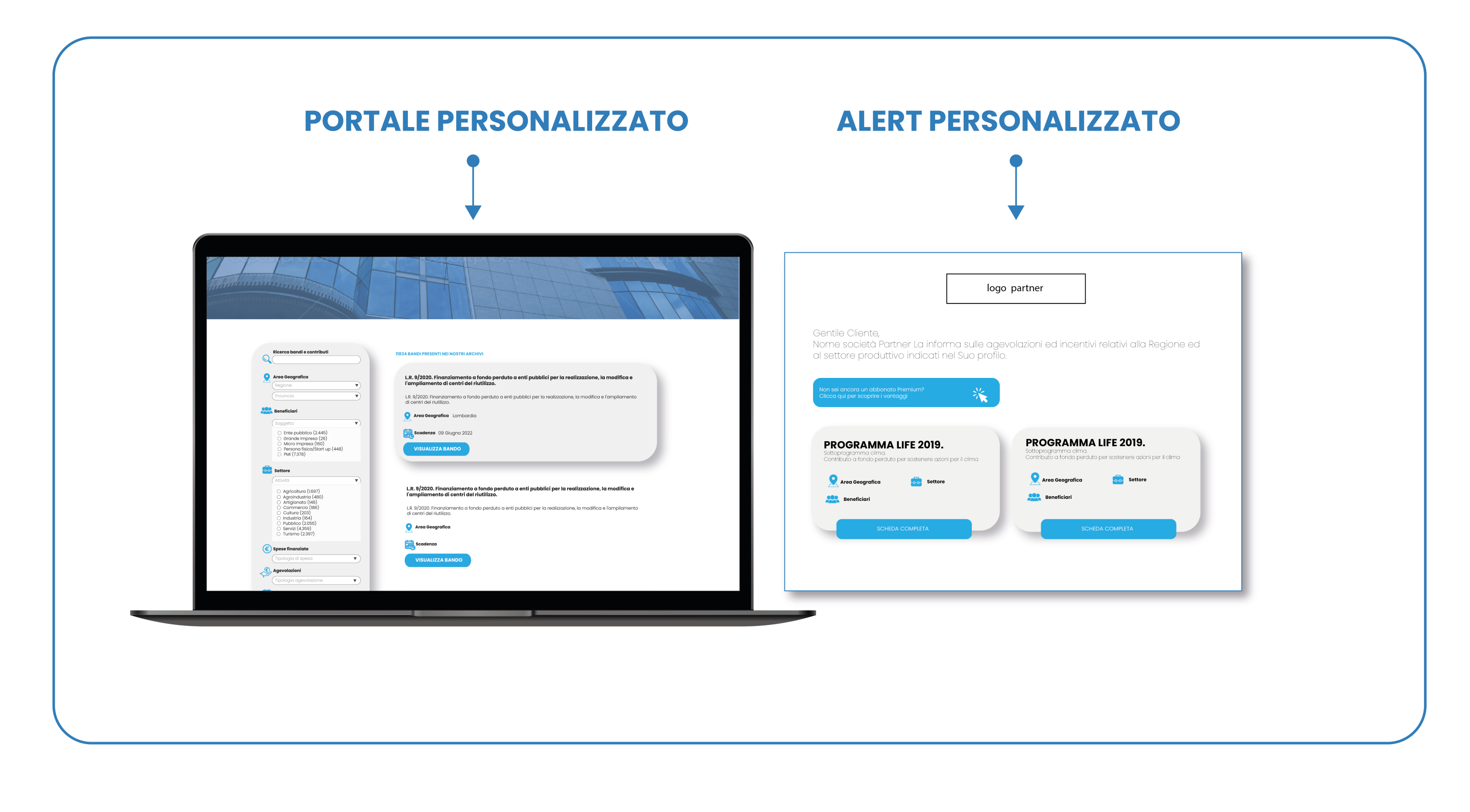 Risparmia tempo e offri ai tuoi clienti un servizio di informativa puntuale sulle opportunità di finanziamento attive grazie all’integrazione del nostro database e del nostro sistema di Alert sul tuo sito.